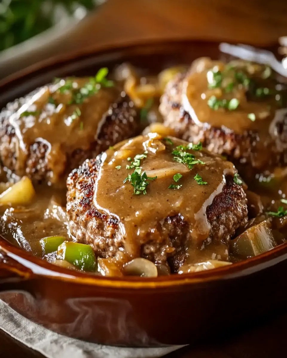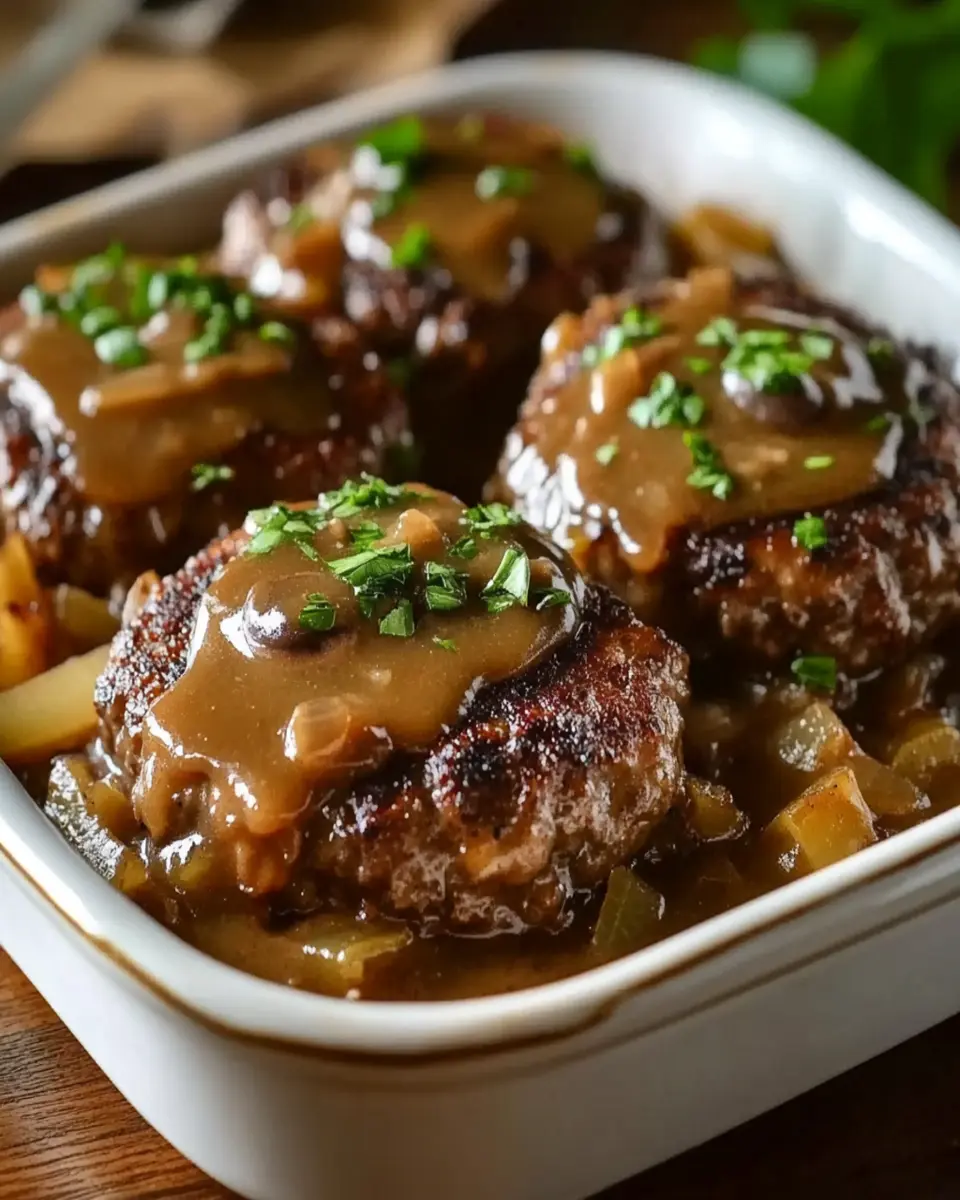 Beef gravy ties everything together, adding richness and moisture. It’s poured over the patties and vegetables, ensuring each bite is flavorful and satisfying.