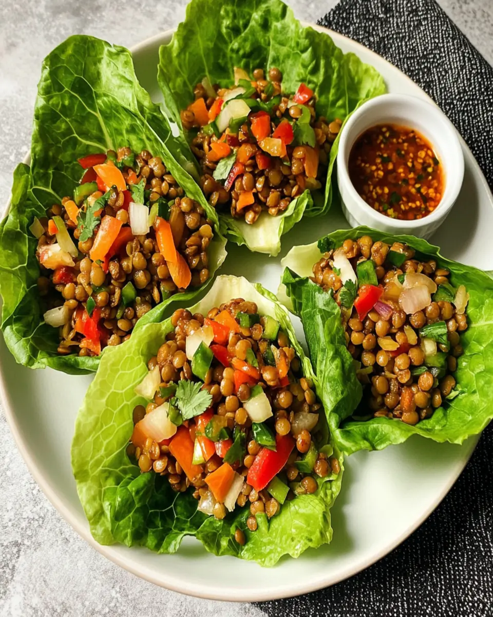 Crisp lettuce leaves serve as the perfect vessel for the lentil mixture, making them easy to hold and eat. They add a refreshing crunch and lightness to the dish.