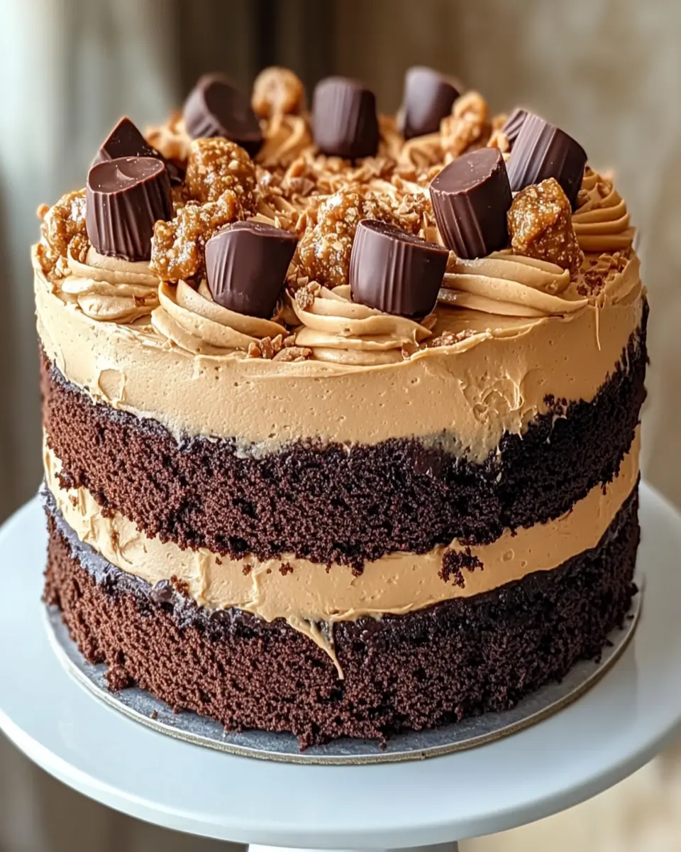This Chocolate Peanut Butter Layer Cake is a decadent dessert that combines rich chocolate cake with creamy peanut butter frosting.