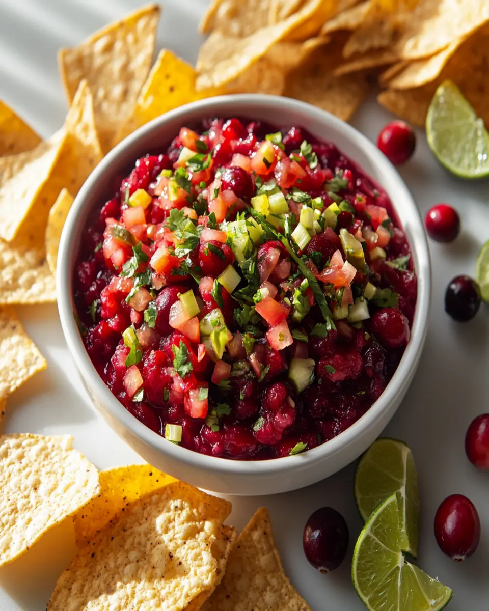 A vibrant and tangy cranberry salsa that combines fresh cranberries, jalapeños, and cilantro for a perfect holiday condiment.