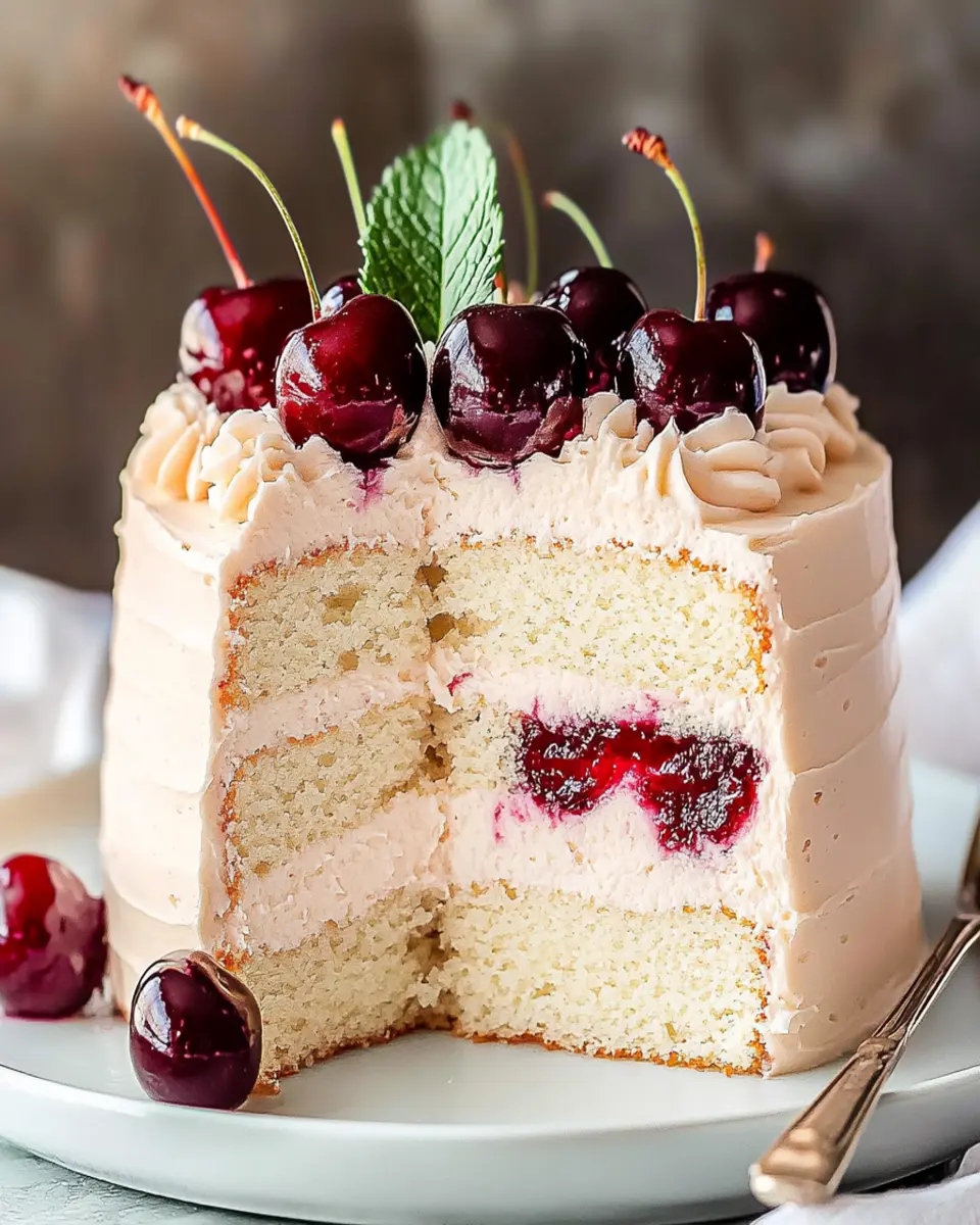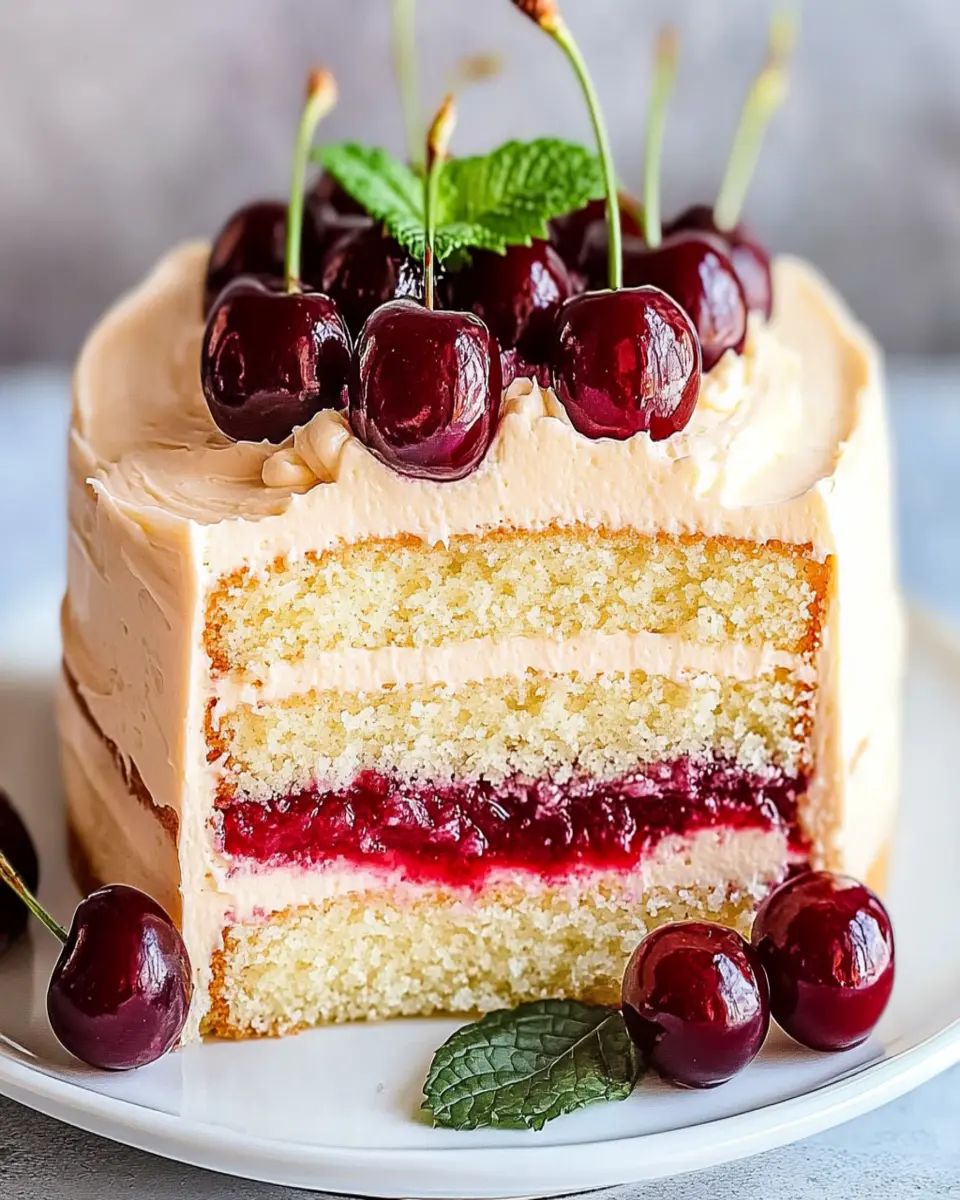 This cake is easy to make, requiring minimal time and effort, making it perfect for busy young professionals who still want to indulge in homemade goodness. With its vibrant cherries and creamy base, it’s sure to impress guests and create lasting memories. So, why wait? Gather your ingredients, bake this delightful cake, and share it with loved ones. You won’t regret it!