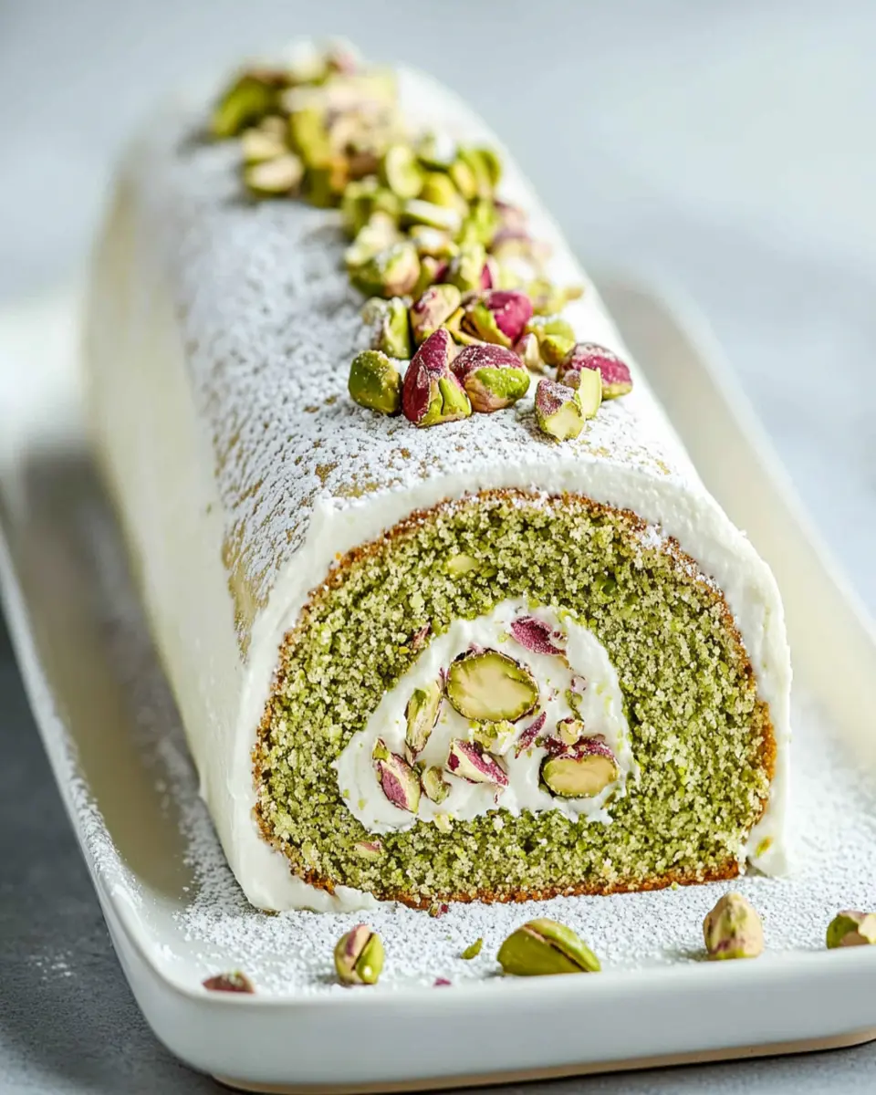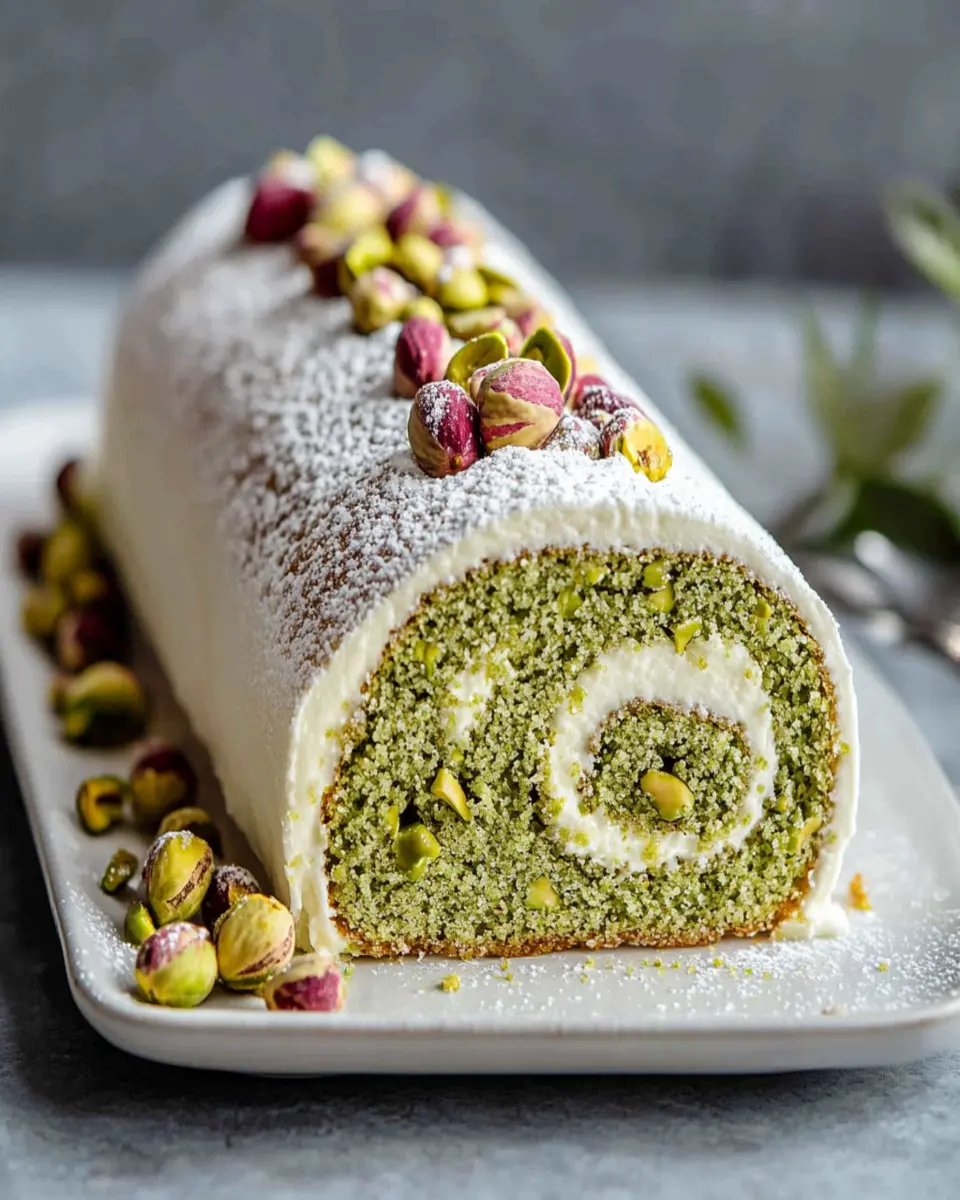 This delightful pistachio roll cake is perfect for any occasion, combining a light sponge with rich flavors.