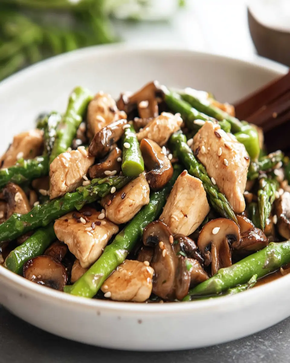 A delicious and healthy stir fry featuring chicken, mushrooms, and asparagus.
