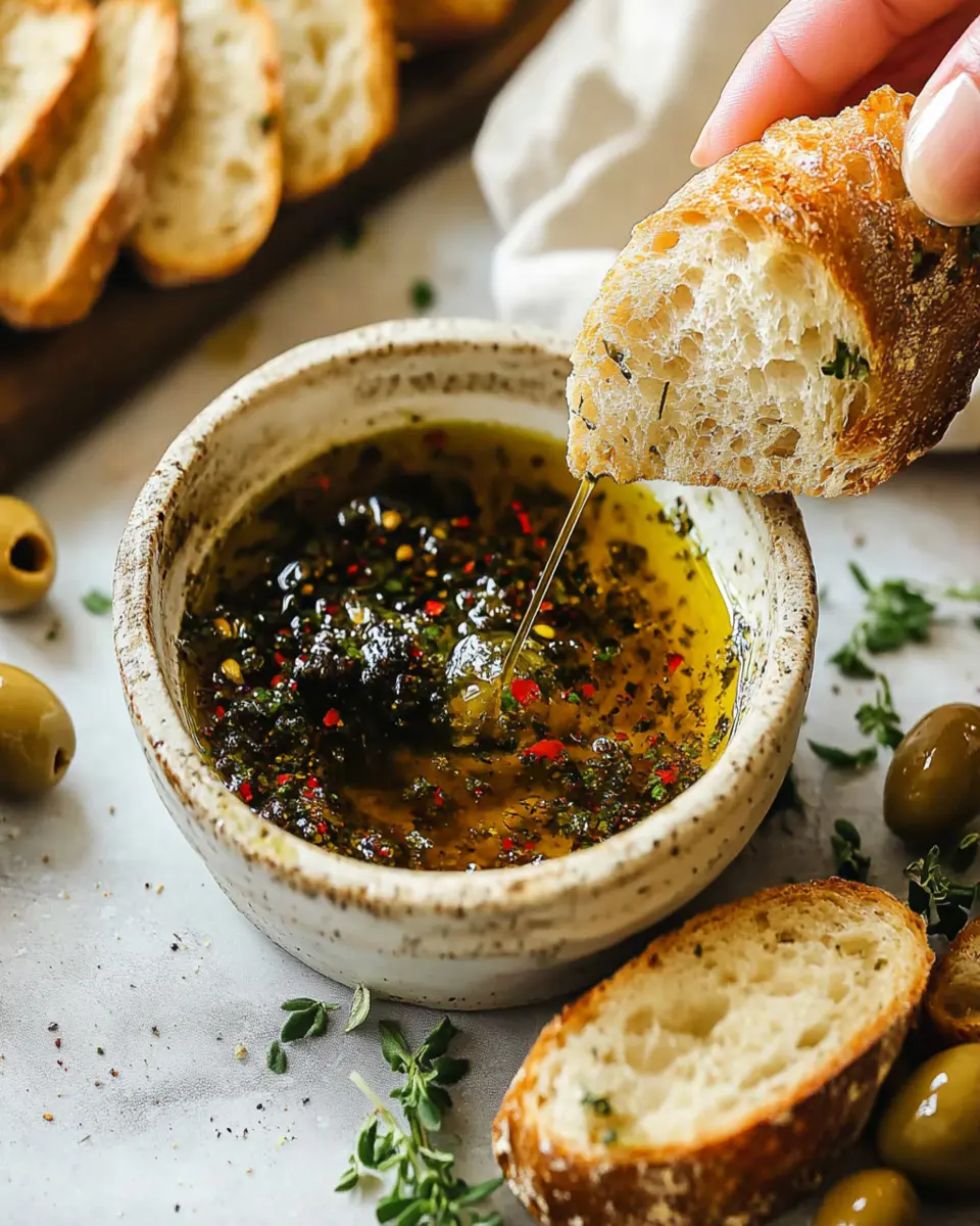 In conclusion, Olive Oil Bread Dip is a simple yet delightful appetizer that brings vibrant flavors to your table. This easy-to-make dip not only complements a variety of breads but also serves as a versatile addition to any meal or gathering. With its rich blend of extra virgin olive oil, balsamic vinegar, and fresh herbs, it’s a guaranteed crowd-pleaser. Whether you’re hosting a dinner party or enjoying a casual evening, this dip is sure to impress your guests. Don’t forget to allow it to sit for at least 30 minutes for the best flavor!