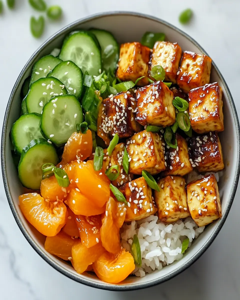 The Sesame Apricot Tofu Bowl is a nutritious and flavorful dish that combines firm tofu, sweet apricots, and mixed vegetables, all tossed in a savory sesame oil and soy sauce mixture. It’s served over a bed of quinoa, making it a wholesome meal.