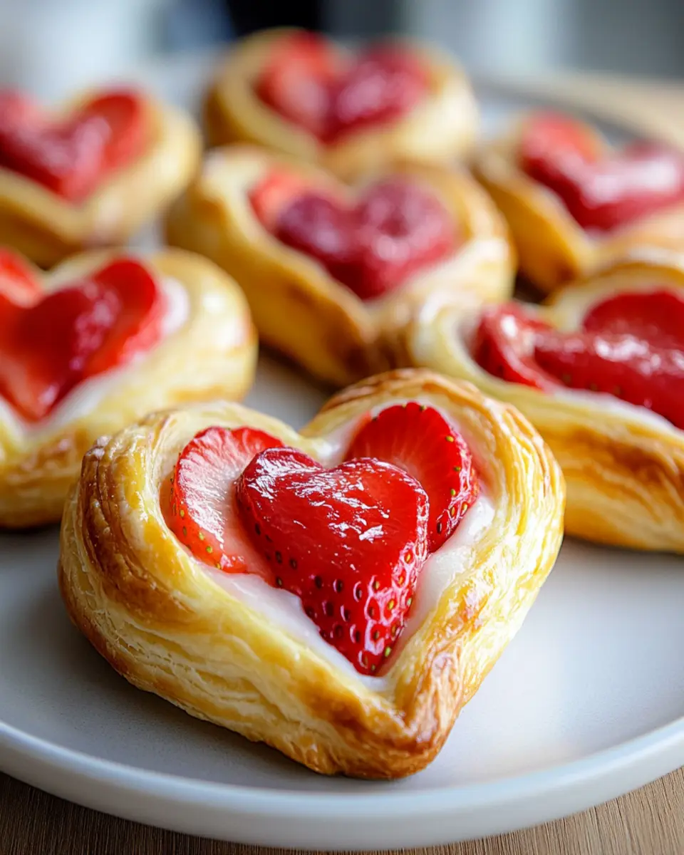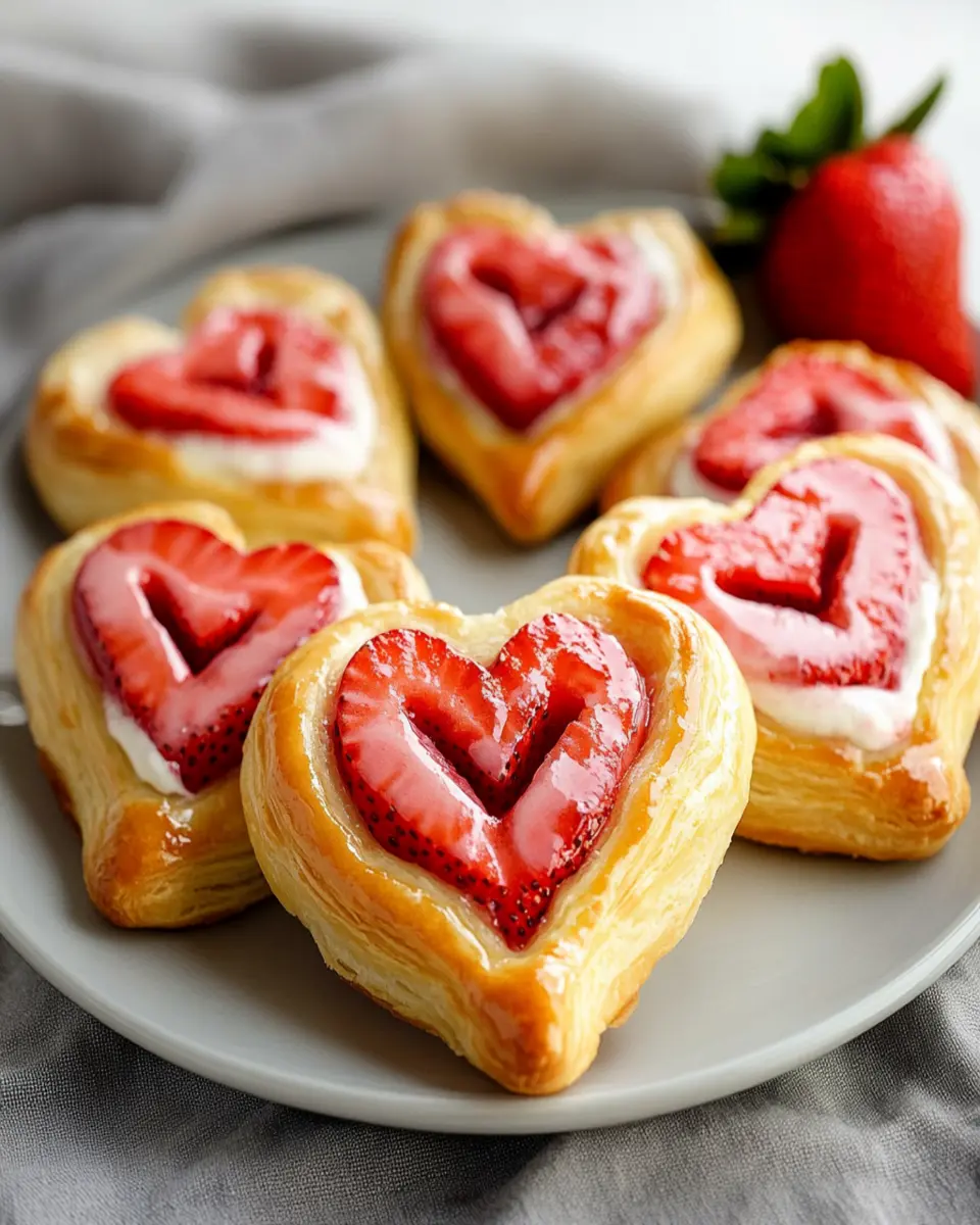 Strawberry Cream Cheese Heart Danishes are delightful pastries made with flaky puff pastry, creamy filling, and fresh strawberries, shaped into hearts. They are perfect for special occasions and can be served warm or at room temperature.