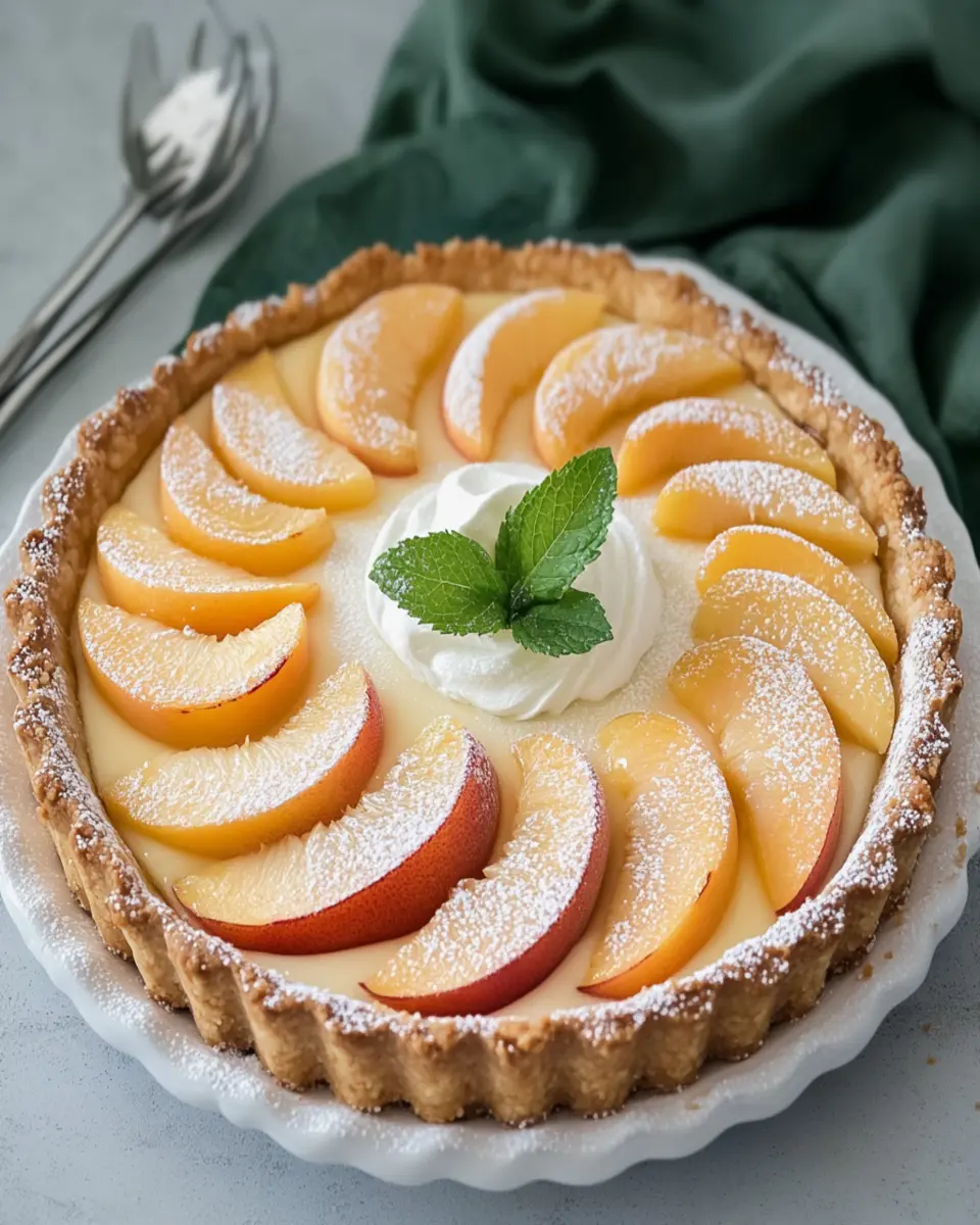 Fresh white peaches are the perfect topping, providing a juicy, sweet contrast to the creamy filling. Their delicate flavor and beautiful color elevate the tart’s presentation and taste.